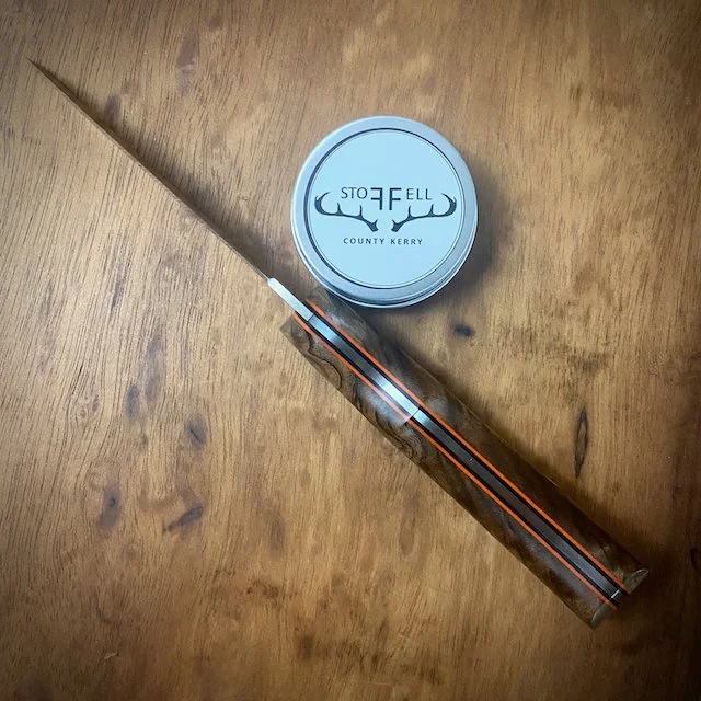 The ‘Mangerton’ is all about the hunt. Many seasons of rigorous field testing by a team of professional stalkers fed into the final design of this knife, resulting in a geometry that blends everything the hunter needs; a sharp, slightly raised point for bleeding the beast and control in the gralloch and a precise upward curve to assist with field dressing and skinning. A deeply recessed finger notch provides a firm grip no matter what nature throws at you.